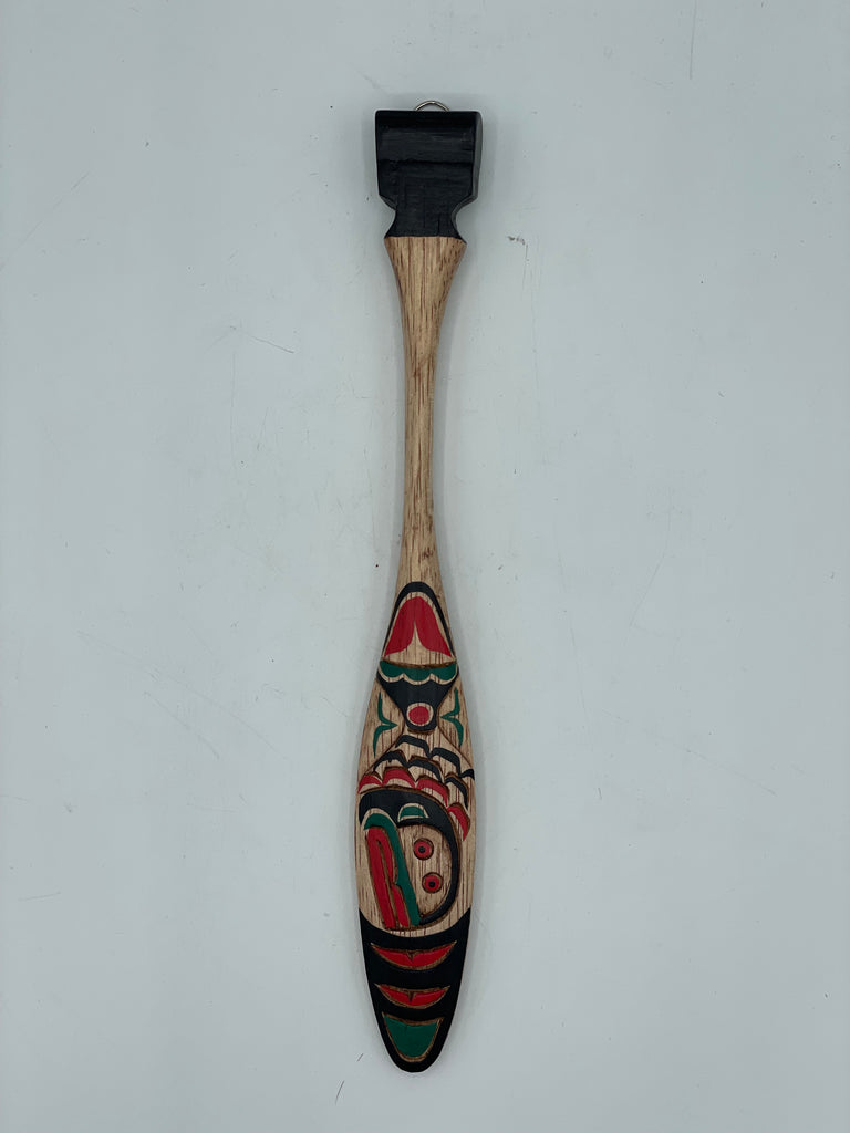A small wooden paddle with carvings from Northwestern tribal designs. Measuring about 10.5" long, has a metal hook on the grip of the paddle for hanging. Three different varieties available.