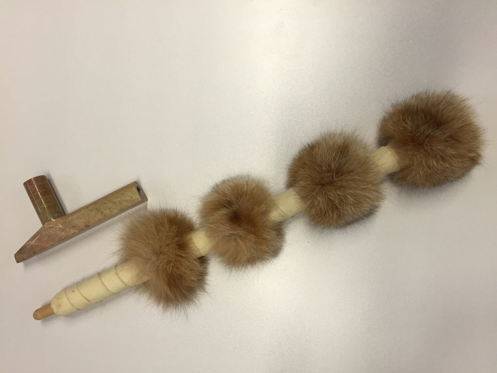 This pipe is wrapped in leather and tufts of rabbit fur. It is approx 20 inches long. The end is made of stone.